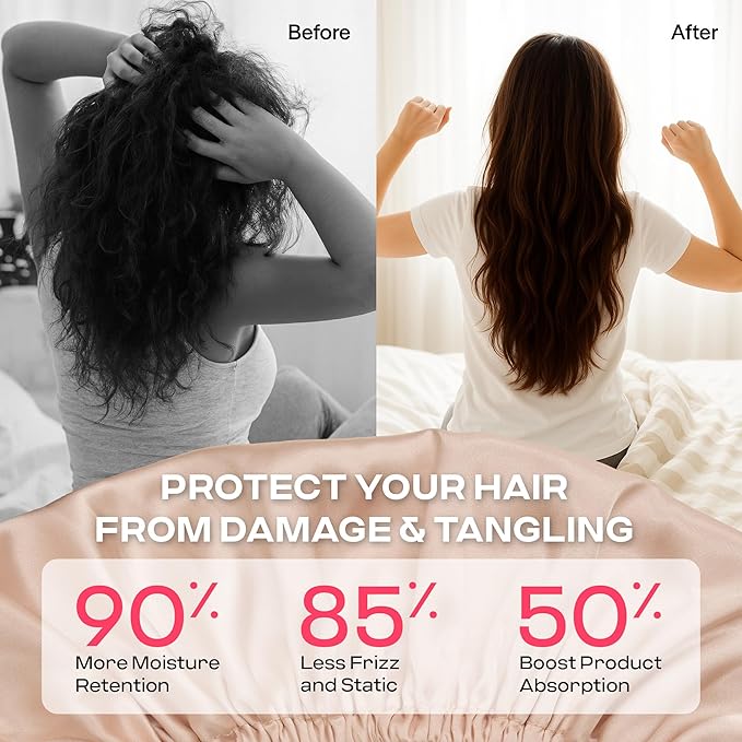 - Gentle on Hair: Made from premium soft silk satin, this double-layered bonnet protects long, thick, or curly hair from frizz and dryness overnight, preserving curls and retaining moisture for healthier locks - perfect for silk press wrap, heatless curls, or natural black hair.