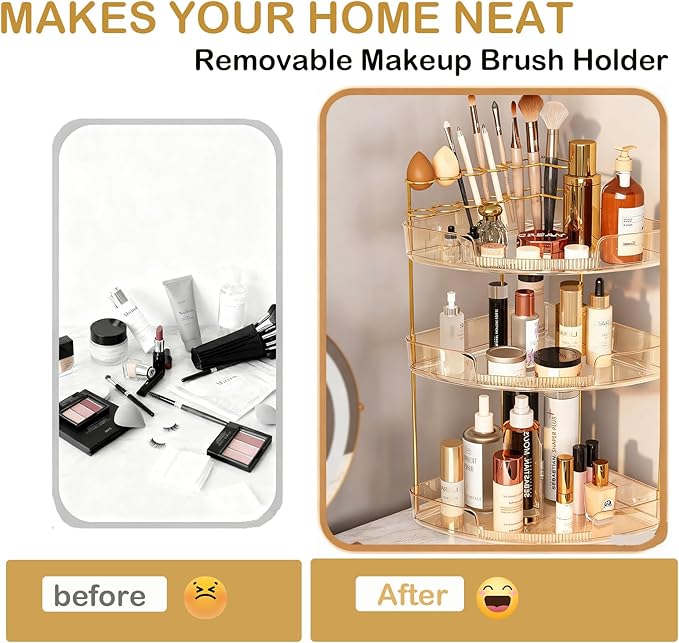 - Corner Makeup Organizer: Fully utilize your vanity countertop space with this innovative organizer, adding 100% extra storage while eliminating clutter; perfect makeup storage solution for a tidy bathroom or desk setup