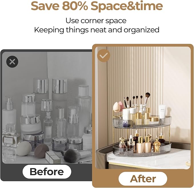- Corner Makeup Organizer: Fully utilize your vanity countertop space with this innovative organizer, adding 100% extra storage while eliminating clutter; perfect makeup storage solution for a tidy bathroom or desk setup
