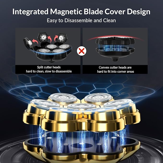 - Multi-functional Shaver Specifically Designed for Men: Exclusive 7D concave blade design fits head and face contours better. Whether it’s shaving your beard or going completely bald, this shaver has you covered. Integrated magnetic detachable head offers a professional floating shave for bald men. Easy to remove and rinse, perfect for men who value speed, cleanliness, and no-fuss maintenance