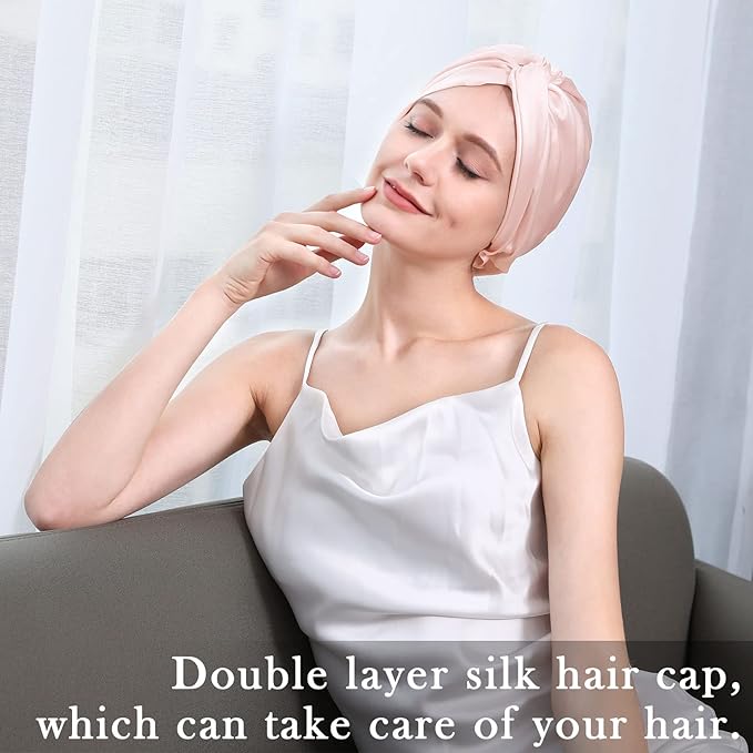 • ➰SILK FABRIC: 100% mulberry silk 22mm 6A grade silk, the sleep bonnet is double-lined silk inside and outside, smooth, soft and comfortable. Breathable and lightweight, it can reduces friction between your hair and the pillow, keeping moisture in your hair from tangling, protects your hair from damage and dust
