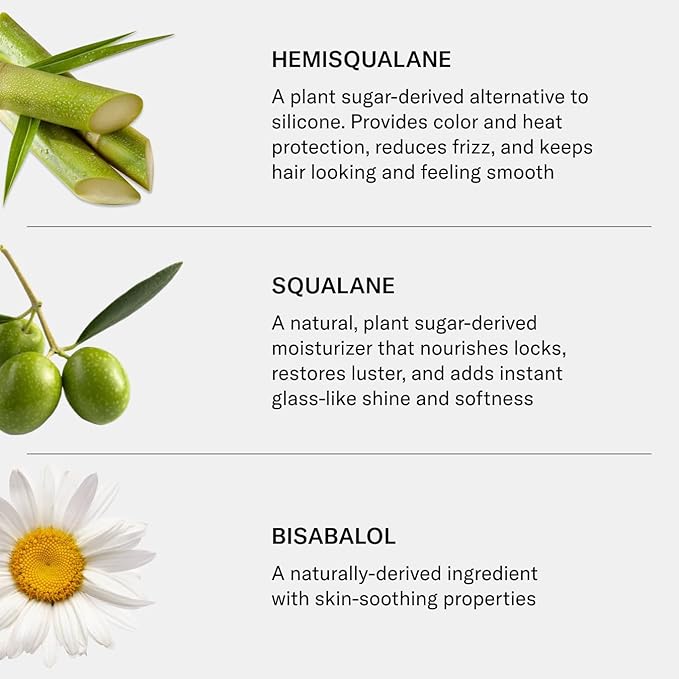 - Hero Ingredients: Hemisqualane (C13-15 Alkane): A plant sugar-derived alternative to silicone. Provides color and heat protection, reduces frizz, and keeps hair looking and feeling smooth. Squalane: A natural, plant sugar-derived moisturizer that nourishes locks, restores luster, and adds instant glass-like shine and softness. Moringa Oleifera: Helps to repair and strengthen dry, damaged hair. Bisabalol: A naturally-derived ingredient with skin-soothing properties