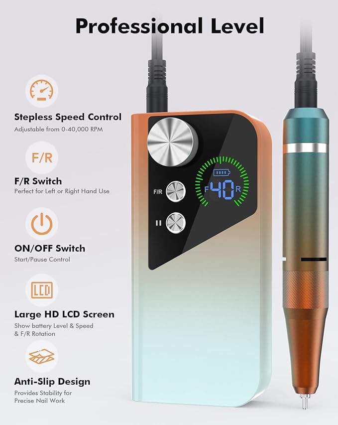 - User-friendly Design: The large HD LCD screen displays battery level, speed, and rotation direction, making it easy to monitor and customize settings. The compact design and ergonomic handle ensure comfortable grip and control while working on nails