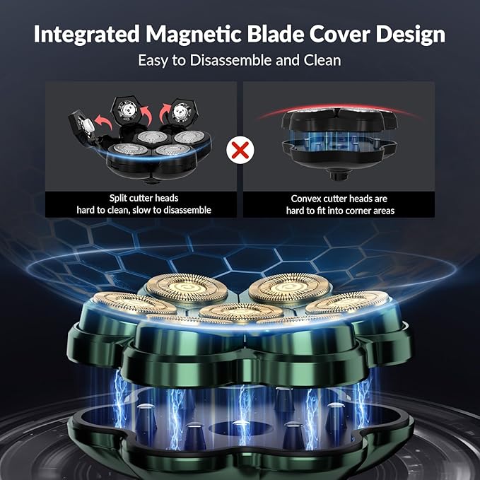 - Multi-functional Shaver Specifically Designed for Men: Exclusive 7D concave blade design fits head and face contours better. Whether it’s shaving your beard or going completely bald, this shaver has you covered. Integrated magnetic detachable head offers a professional floating shave for bald men. Easy to remove and rinse, perfect for men who value speed, cleanliness, and no-fuss maintenance