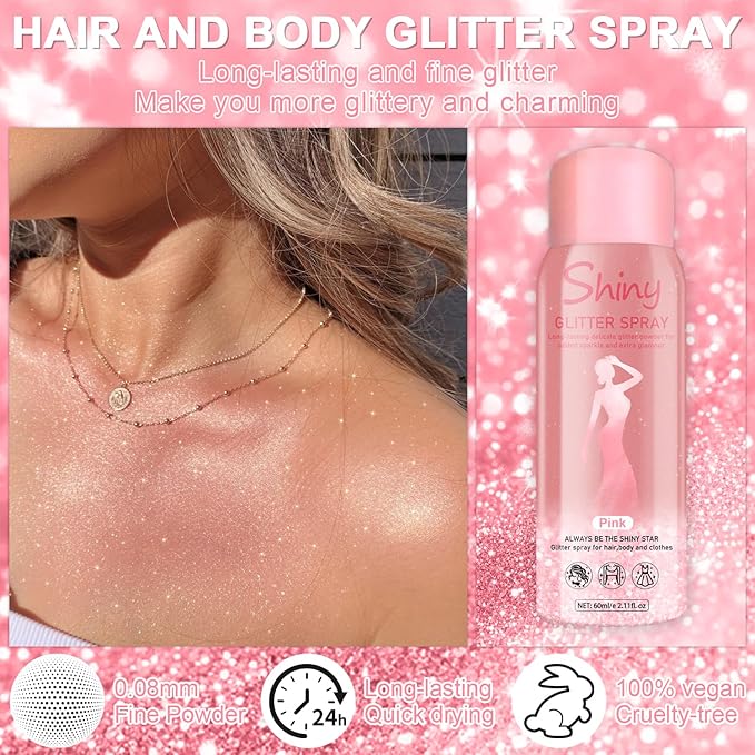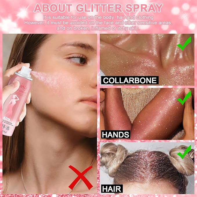 - 【Healthy Ingredients】Made with skin-friendly, non-toxic ingredients, this glitter spray is safe for women and girls. The lightweight, high-shine formula won’t irritate skin or hair. Plus, it’s cruelty-free and eco-conscious, so you can sparkle guilt-free!
