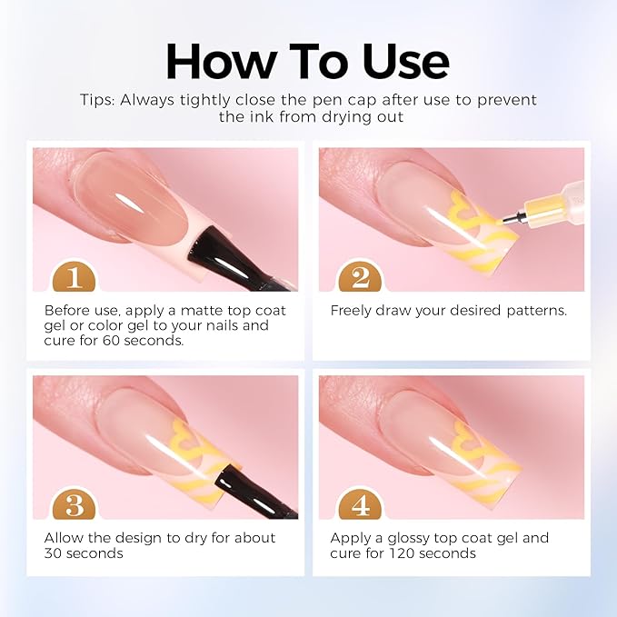 - 【Easy to Use 】Before using, shake each of these nails art marker pens well and gently press the tip vertically a few times to start the ink flow. After use, wipe the tip clean and securely recap the pen to prevent drying, ensuring smooth performance every time.