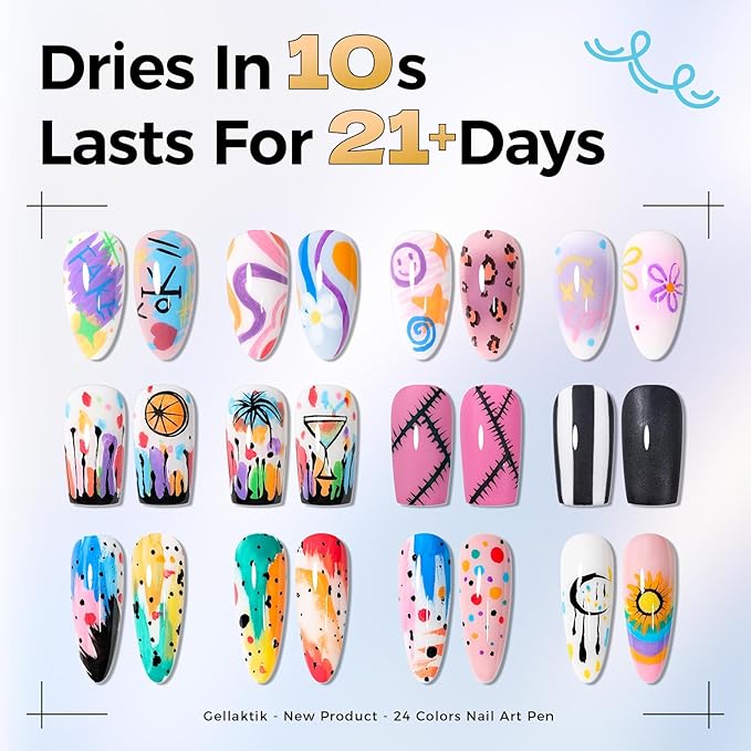 - 【Quick-Drying & Long-Lasting Colors】Formulated to dry quickly upon application, these nail polish pens help prevent smudging from accidental touches. The intense, fade-resistant colors stay vibrant and fresh, ensuring your nail art remains brilliant. For extended, waterproof wear and enhanced durability, simply seal your design with a top coat.