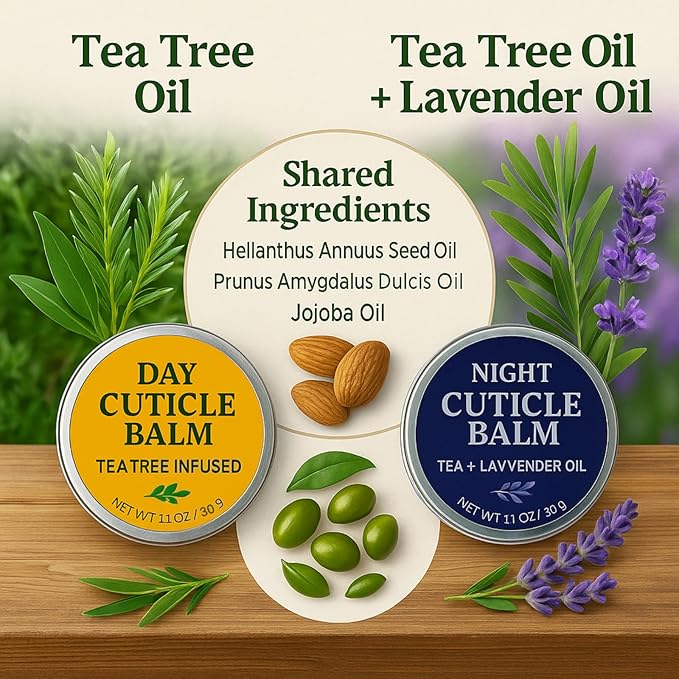 Tea Tree Oil Cuticle Balm Day & Night Set - Cuticle Cream & Butter for Dry, Damaged Cuticles - Includes Cuticle Brush for Easy Application - Cuticle Healing Treatment Moisturizer, 1.1 OZ 2PK