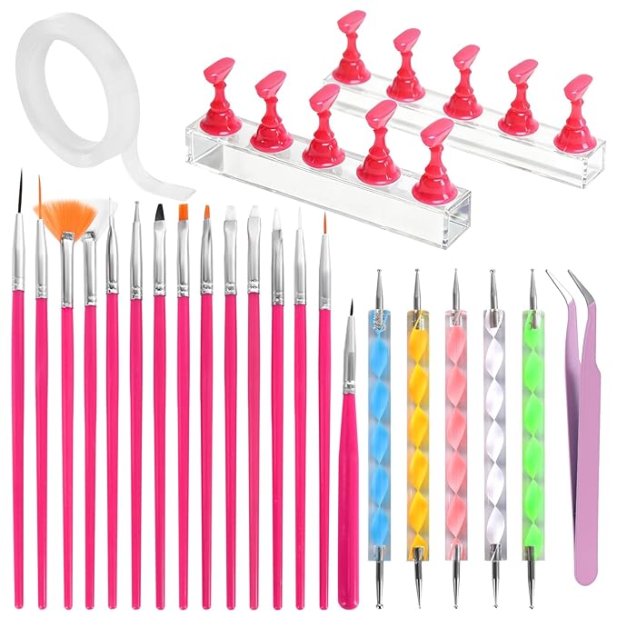 - Comprehensive Nail Art Tools Set: Includes 15 pcs nail brushes (varied sizes/shapes for detailed designs), 5 double-sided dotting tools (for dots, petals, and patterns), 2 magnetic nail stand sets (10 chess-shaped stands and 2 rectangular clear bases), 1 tweezers (handles rhinestones, beads, stickers), and 1 double-sided tape (cut-to-fit for press ons). Designed for creating detailed nail art in home or salon settings.