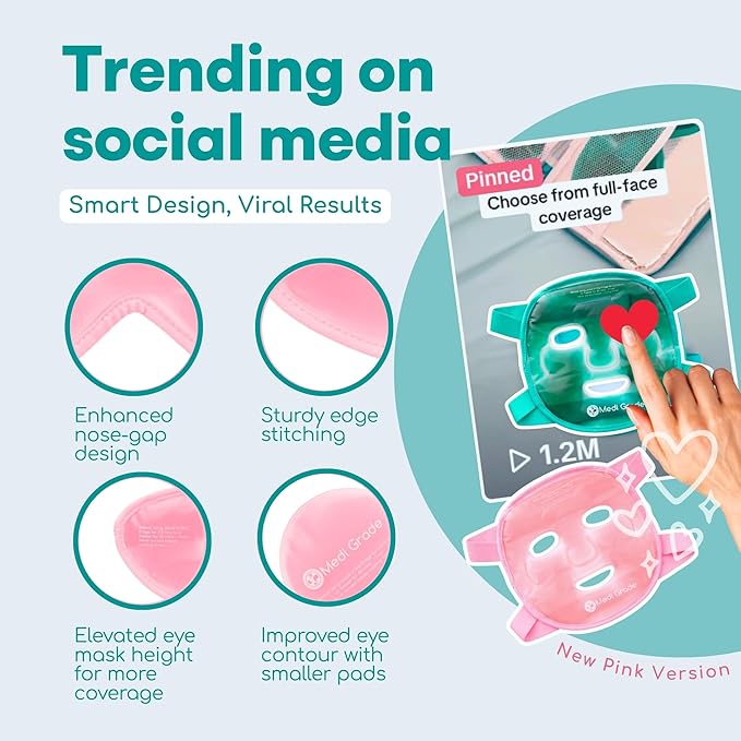 Medi Grade Cooling Ice Face Mask and Cooling Eye Mask for Puffy Eyes, Pink - Self Care Face Ice Pack with ChillGel Face Ice Mask Technology - Cooling Face Mask, Eye Pads and Bag