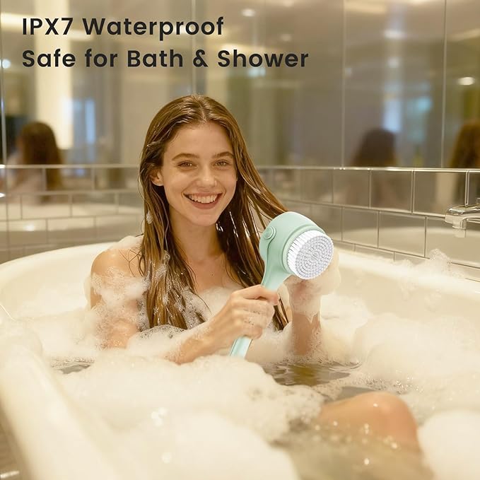 - IPX7 Waterproof Design for Bathroom Safety:Built with IPX7 waterproof technology, the brush is fully safe to use in the shower or bath. No need to worry about water damage—you can easily clean every part of your body while enjoying a relaxing bath, and the detachable brush head is simple to rinse and dry after use.