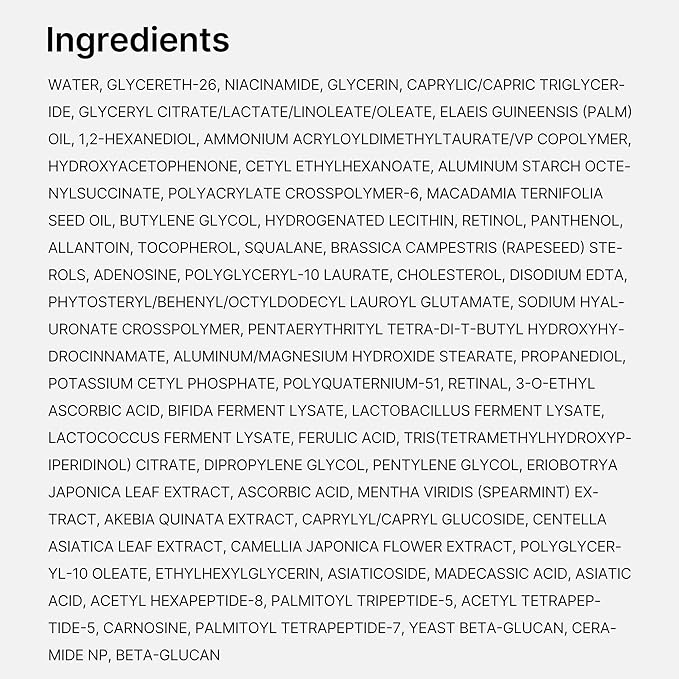 - [HOW TO USE] Apply a small amount in the evening after cleansing, focusing on areas of concern. Begin with use every other night and adjust frequency based on skin tolerance. Retinol is sensitive to light and heat—nighttime use is recommended. Apply sunscreen during daytime use.