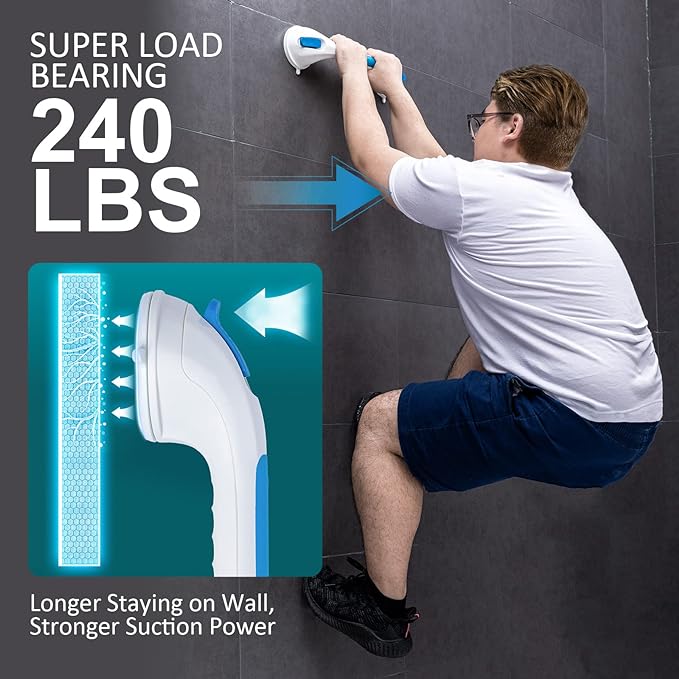 - Easy for Installation: Each suction cup shower handle equips 2 Strong suction cups with locking latches to provide stable protection. The bathtub hand rail ONLY needs to pull down the latches with 5 seconds and the installation is done, quickly and effortlessly! NO drilling, NO screws, NO glue and NO tools are required, fully removable, reusable and causing no damage to your wall