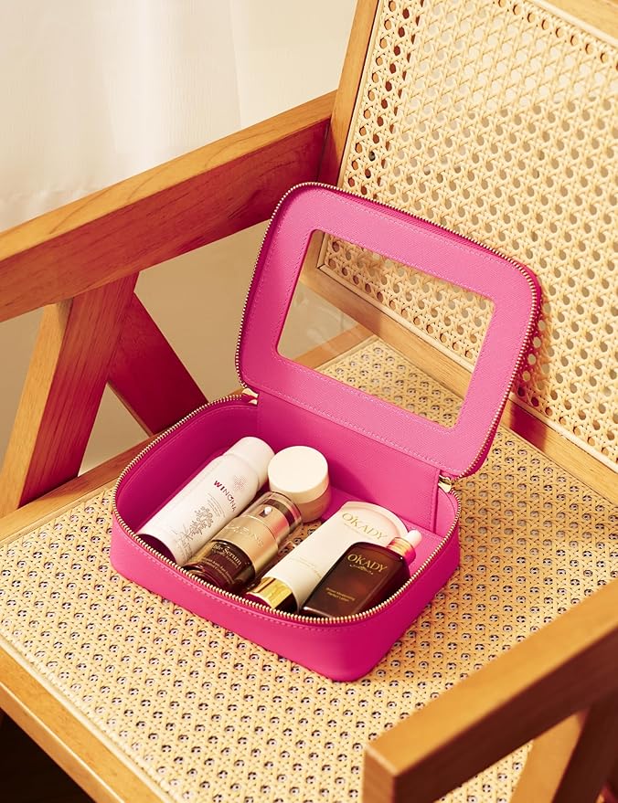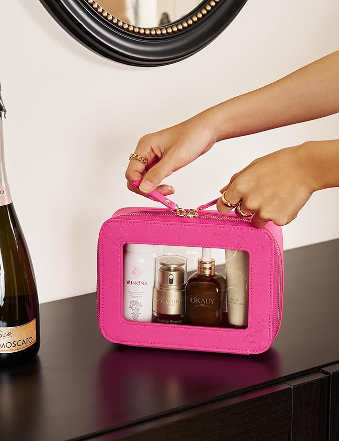 - [Premium Material and Durability] – The clear cosmetic cass, both the exterior and interior, is crafted from high-grade saffiano faux leather, which is highly scratch resistant, durable and exceptionally easy to keep clean. It features a smooth zipper for secure closure, and elegant light gold metal hardware accents, adding a luxurious and sophisticated touch to the bag's overall design.