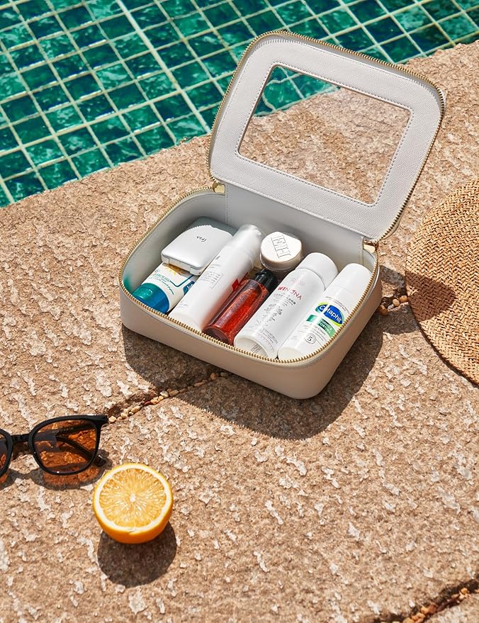 • [Premium Material and Durability] – The clear cosmetic cass, both the exterior and interior, is crafted from high-grade saffiano faux leather, which is highly scratch resistant, durable and exceptionally easy to keep clean. It features a smooth zipper for secure closure, and elegant light gold metal hardware accents, adding a luxurious and sophisticated touch to the bag's overall design.
