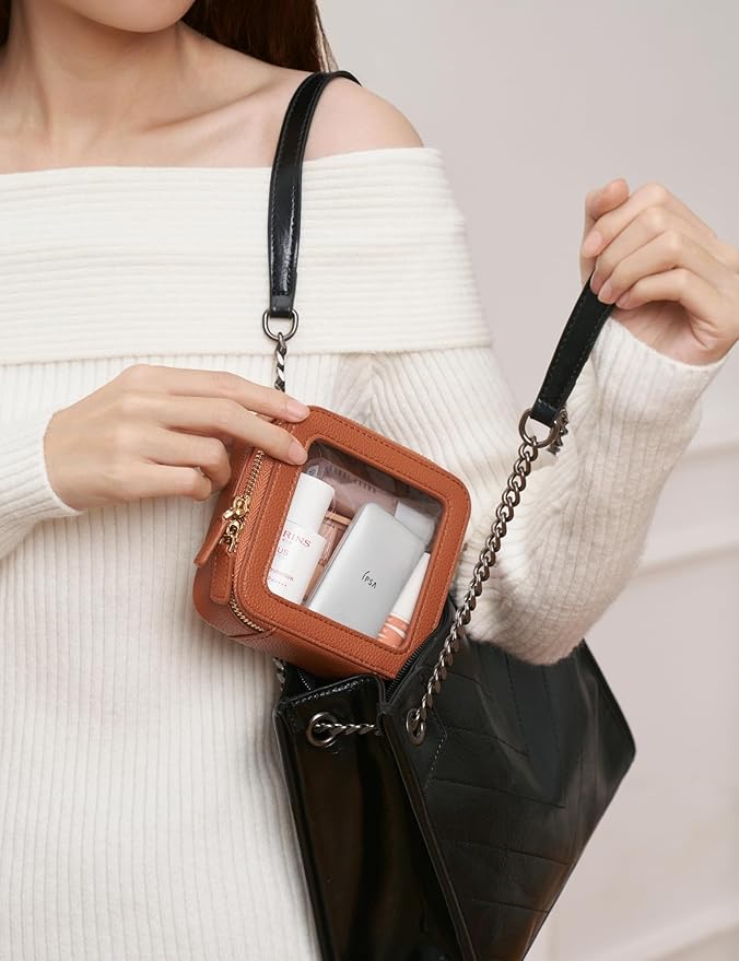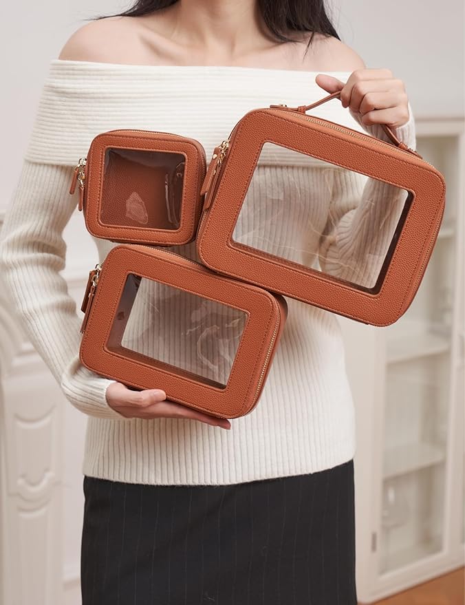 - [Premium Material and Durability] – The clear cosmetic cass, both the exterior and interior, is crafted from high-grade faux leather, which is highly scratch resistant, durable and exceptionally easy to keep clean. It features a smooth zipper for secure closure, and elegant light gold metal hardware accents, adding a luxurious and sophisticated touch to the bag's overall design.