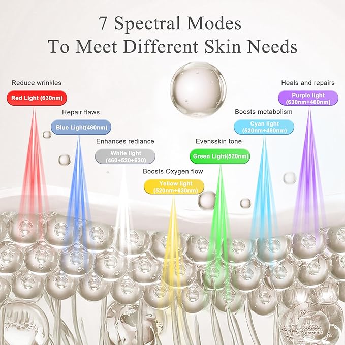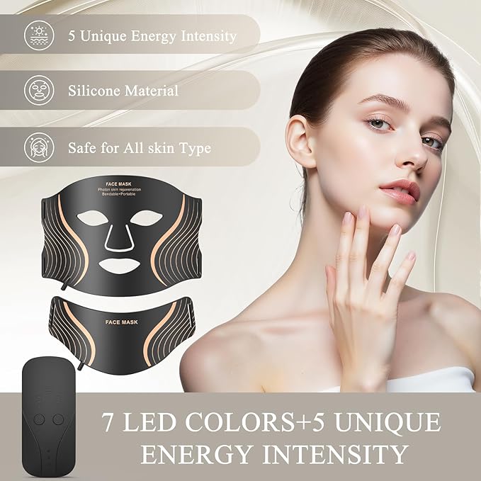 - 【7 Light Modes & 5 Adjustable Intensity Levels】Customize your at-home facial session with 7 light therapy modes and 5 brightness levels. Whether targeting wrinkles, uneven tone, or dullness, you can choose the mode that suits your skin’s needs. The built-in 10-minute timer ensures safe and effortless daily use.