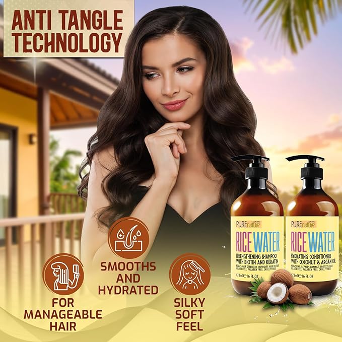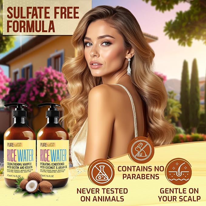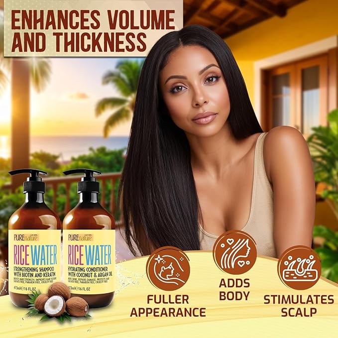 - IMPROVE STRENGTH: Pure Nature Lux Spa’s rice water shampoo and conditioner set nourishes fragile strands. This hair thickening shampoo and conditioner set supports thicker and fuller looking hair.