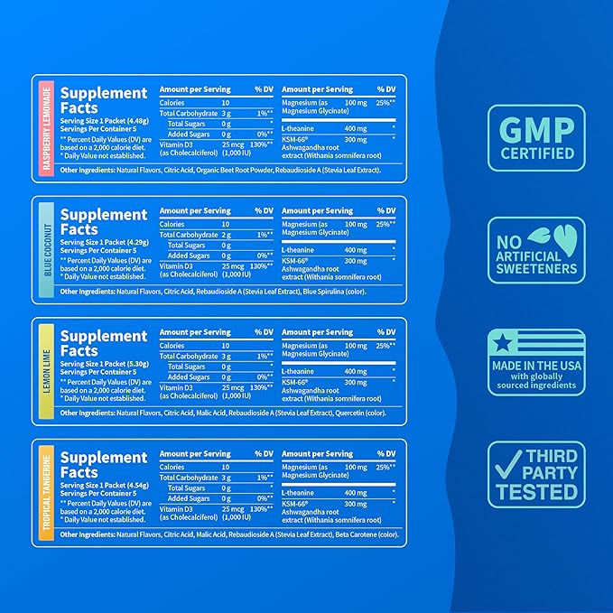 - OPTIMIZE YOUR SLEEP EXPERIENCE: Welcome the rejuvenating sleep your body craves. Our Variety Pack flavor offers more than just taste - it contains ingredients such as KSM-66 Ashwagandha, L Theanine and Chelated Magnesium Glycinate, each selected for their association with optimized sleep patterns. Enjoy the potential for quicker sleep onset, sustained sleep, deeper rest, and a revitalized awakening.