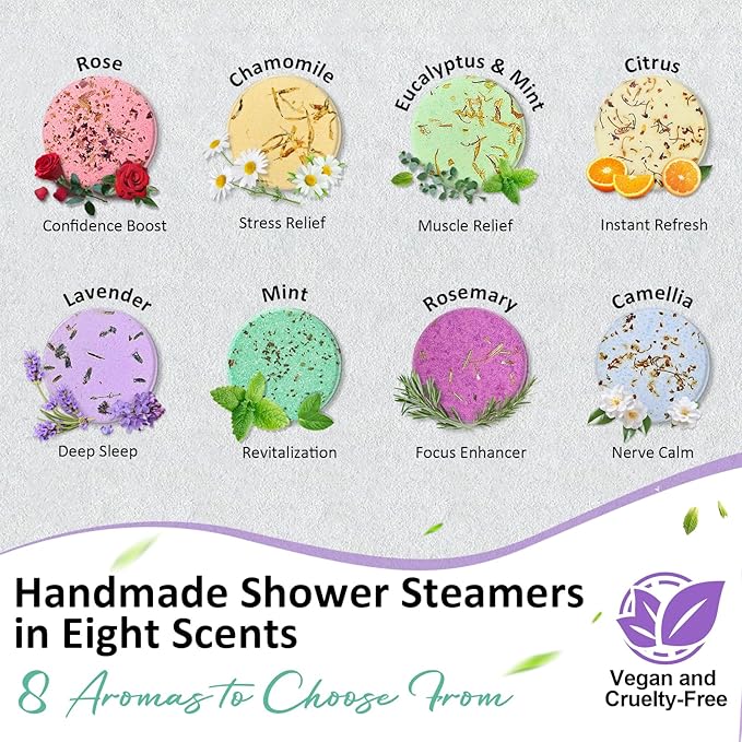 - 8 Scents 8 Unique Shower Experience - RUSEMLE aromatherapy shower steamer gift set includes 8 natural scents: 1*Rose, 1*Lavender, 1*Eucalyptus & Mint, 1*Mint, 1*Chamomile, 1*Citrus, 1*Rosemary, and 1*Camellia. Each one will bring you a delightful surprise shower experience.