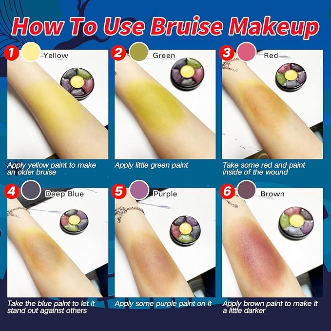 - RICH COLORS: Come with 3pcs bruise wheel paint and 3pcs black stipple sponges.6 Colors in a palette! You'll marvel at the colors in your Professional Face and Body Paint Palette.To create realistic bruises makeup Trauma SFX Makeup for Halloween with MEICOLY 6 colors face body paint palette.