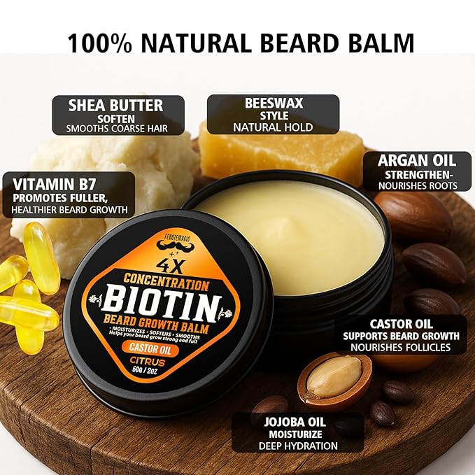 - β Maximum Biotin beard balm for men designed to soothe, stop beard itch, and smooth coarse hair while promoting healthier beard growth and conditioning beard with natural oils