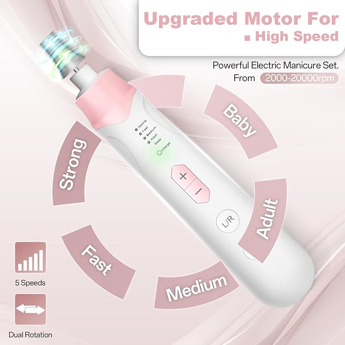 - 【5 SPEED & Dual Rotations】Experience the power of our nail file electric drill kit, featuring 5 progressive speed settings and versatile clockwise and counter-clockwise rotations. The efile nail dril guarantees precise filing on thick fingernails and fungal toenail grinder for adjustable speeds to suit all nail types.