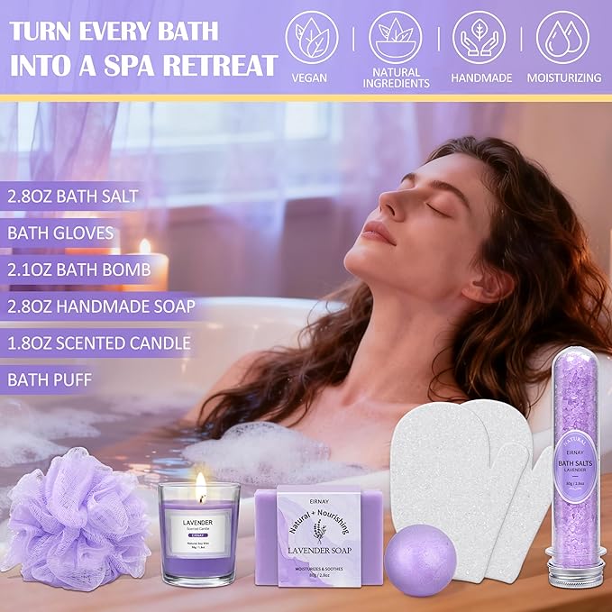 - 【Ideal Spa Gifts For Her】This self care gifts for women give her the ultimate pampering experience. Picture a cozy evening, light the candles, put on some mood music and sink into a relaxing spa evening all to herself. The aromatherapy candle imbues the room with a calming scent, while the bath bomb provides a luxurious spa experience in the tranquility of one's own abode. She could indulge herself with deluxe spa experience.