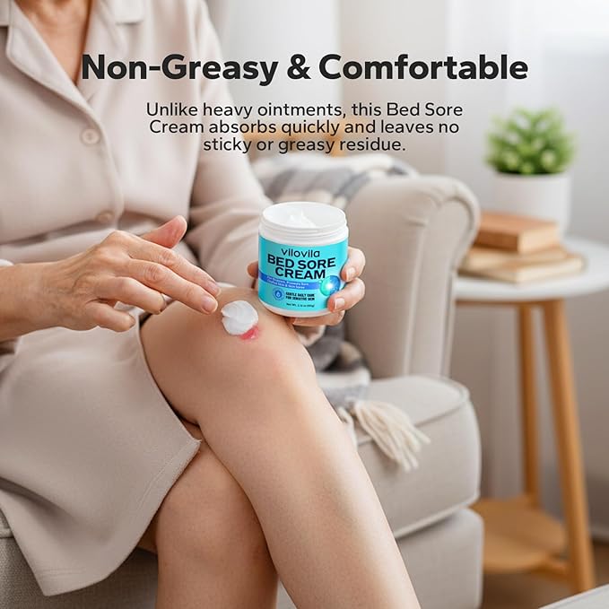 - Non-Greasy & Comfortable: Unlike heavy ointments, this Bed Sore Cream absorbs quickly and leaves no sticky or greasy residue. Its lightweight texture allows skin to breathe and ensures comfort under clothing, bandages, or medical devices. Ideal for bedridden individuals, wheelchair users, or anyone needing daily skin care, it keeps areas prone to Bedsore, Pressure Sore, Chafed Skin, and Skin Sores soft and protected. The formulation balances hydration and comfort, making it easy to use throughout the day without feeling heavy or oily.