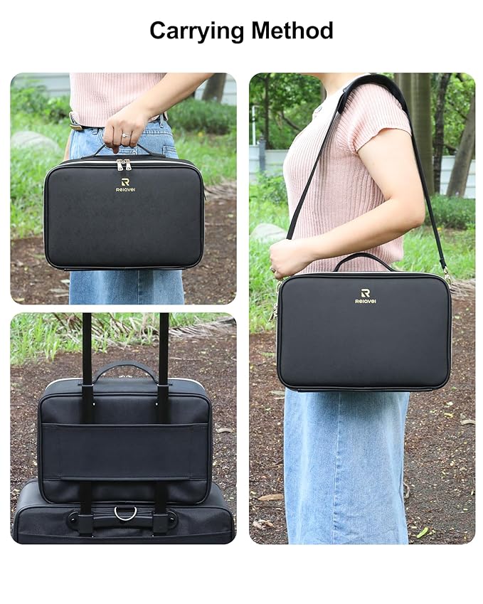 - 【RELAVEL MAKEUP BAG with led mirror】Large capacity makeup organizer case with large makeup brush storage board & 3-color 4K silver-plated cosmetic mirror. Relavel Makeup bag is made of high-quality PU leather, which is durable, water-resistant, and easy to clean. And access easily with dual-way smooth zipper