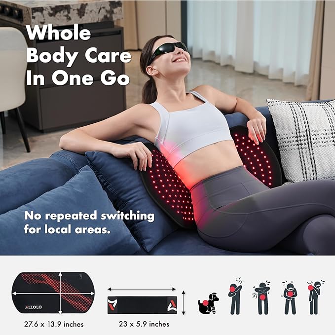 - UPGRADED 3 IN 1 LED BEAD: ALLOLO red light therapy for body has a total of 280pcs professional lamp beads, each lamp contains 3 chips(280*660nm red light and 560*850nm infrared light). And ALLOLO red light therapy belt provides 4 modes, red+infrared light mode, red light mode, infrared light mode, and pulse mode. Pulse mode is our red light therapy wraps all lights (660nm red lights and 850nm infrared lights) at a rate of 600 flicks per minute will generate 10HZ pulse rate energy.