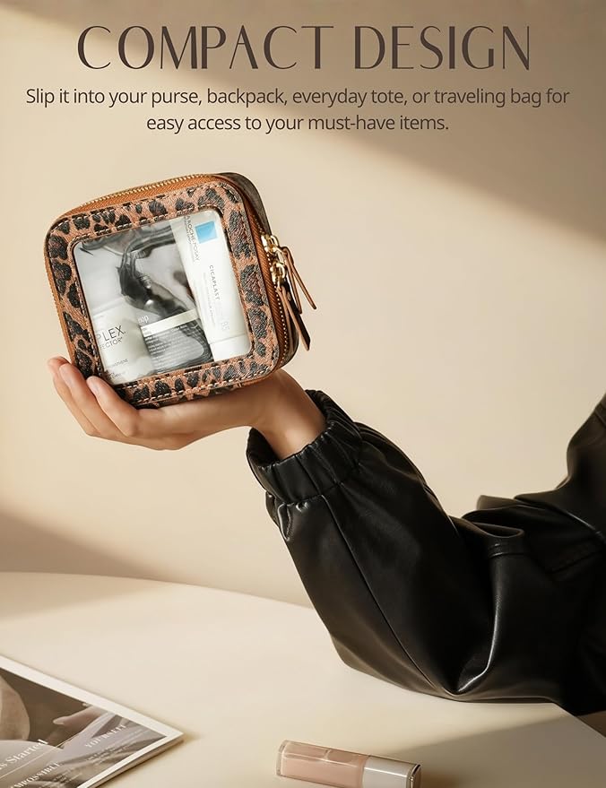 - [Premium Material and Durability] – The clear small cosmetic case, both the exterior and interior, is crafted from high-grade leopard print faux leather, which is highly scratch resistant, durable and exceptionally easy to keep clean. It features a smooth zipper for secure closure, and elegant light gold metal hardware accents, adding a luxurious and sophisticated touch to the bag's overall design.