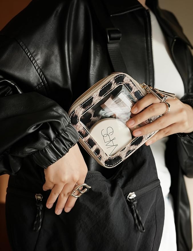 - [Premium Material and Durability] – The clear small cosmetic case, both the exterior and interior, is crafted from high-grade ash leopard faux leather, which is highly scratch resistant, durable and exceptionally easy to keep clean. It features a smooth zipper for secure closure, and elegant light gold metal hardware accents, adding a luxurious and sophisticated touch to the bag's overall design.