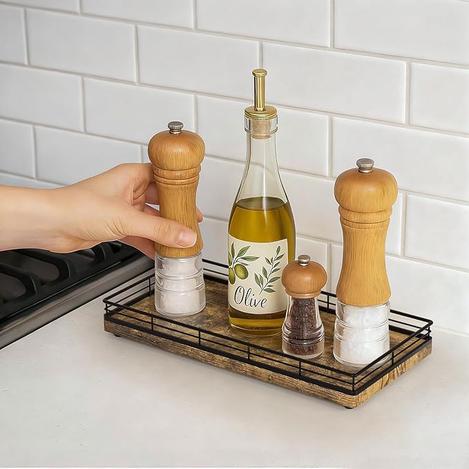 - Elegant Natural Wood & Iron Design: Classic iron-and-wood construction with natural wood grain. Decorative wooden tray that adds warmth and organic style. Sturdy iron frame for durability—ideal for bathroom vanity, countertop, and sink areas