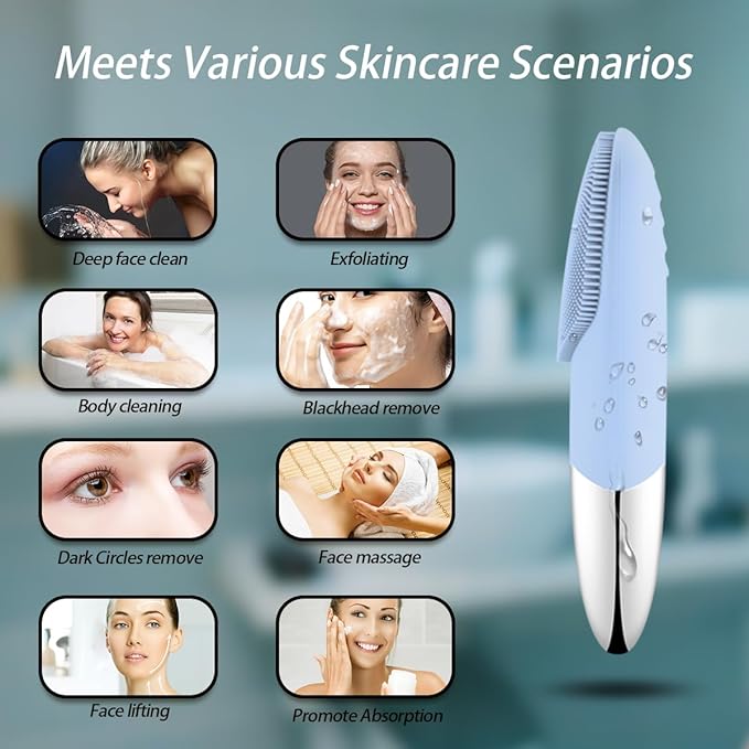Facial Cleansing Brush, 3-in-1 Electric Silicone Face Scrubber, Vibrating Massager, IPX7 Waterproof, USB Rechargeble Pore Brush for Deep Cleanning, Blackhead Remover, Exfoliating (Blue)
