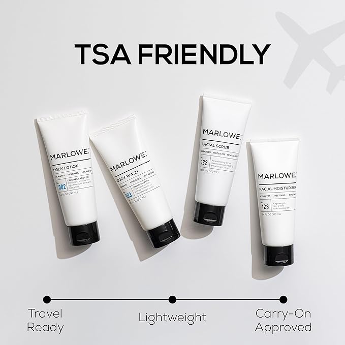 MARLOWE. Travel Essentials Kit, No. 103 Body Wash, No. 002 Body Lotion, No. 122 Facial Scrub & No. 123 Facial Moisturizer, Hydrating, Exfoliating & Nourishing Skin Care Set for All Skin Types