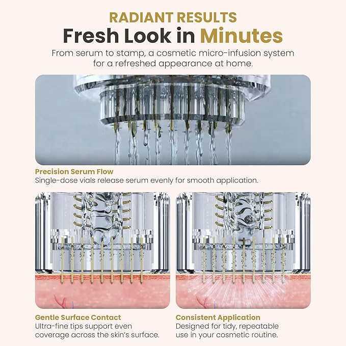 - AT-HOME MICRO-INFUSION TOOL – A spring-loaded stamp with ultra-fine tips pairs with pre-measured serums to create a simple, controlled routine that supports an even, refreshed appearance.