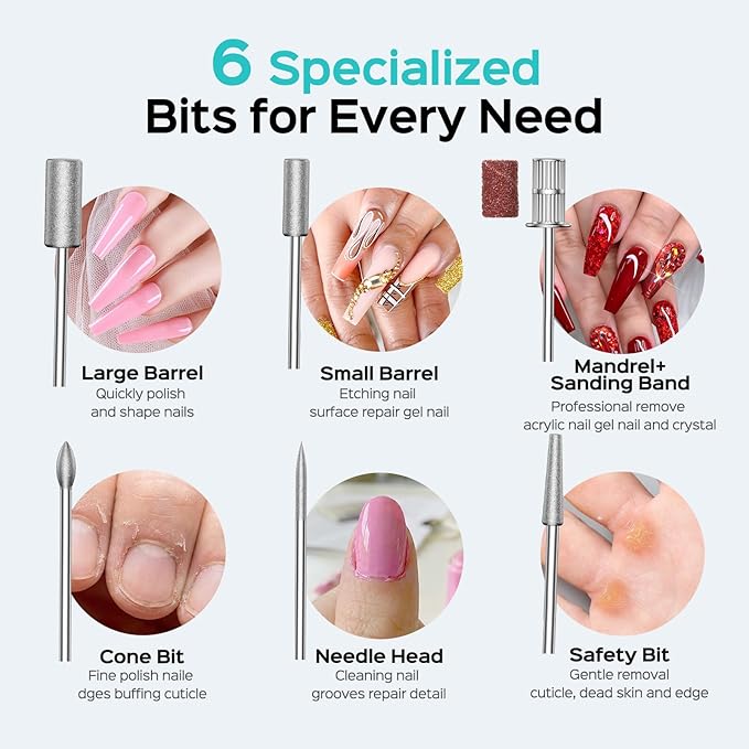 - 25 Speeds - Precise Control, Comfortable Experience: This grinder features 25 precise speed, with a wide rotation range from 4,000 to 25,000 RPM, paired with 6 types of drill bits. Whether you need gentle cuticle care, precise nail shaping, or powerful polishing of acrylic, gel, or dip powder manicures, it provides the ideal speed for every task. Say goodbye to discomfort caused by improper pressure, and easily meet the full range of needs for both at-home care and professional salon services