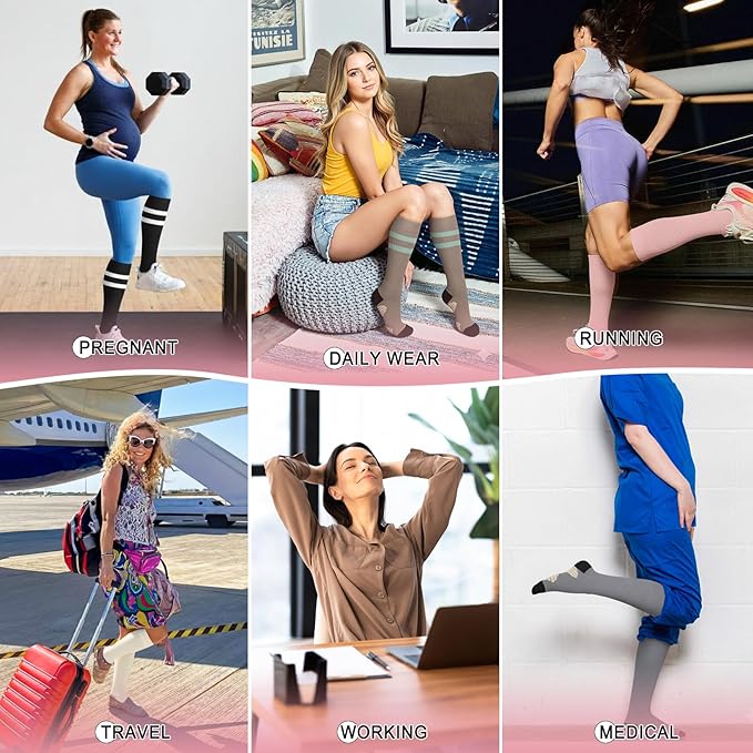• Perfect for Daily Use, Work, Home & Sports– Designed for nurses, teachers, travelers, pregnant women, fitness lovers, and remote workers. These socks are ideal whether you’re on your feet at work, relaxing at home, walking your dog, working out, doing yoga, or recovering after exercise. They help reduce soreness, prevent swelling, and keep your legs refreshed and energized all day.