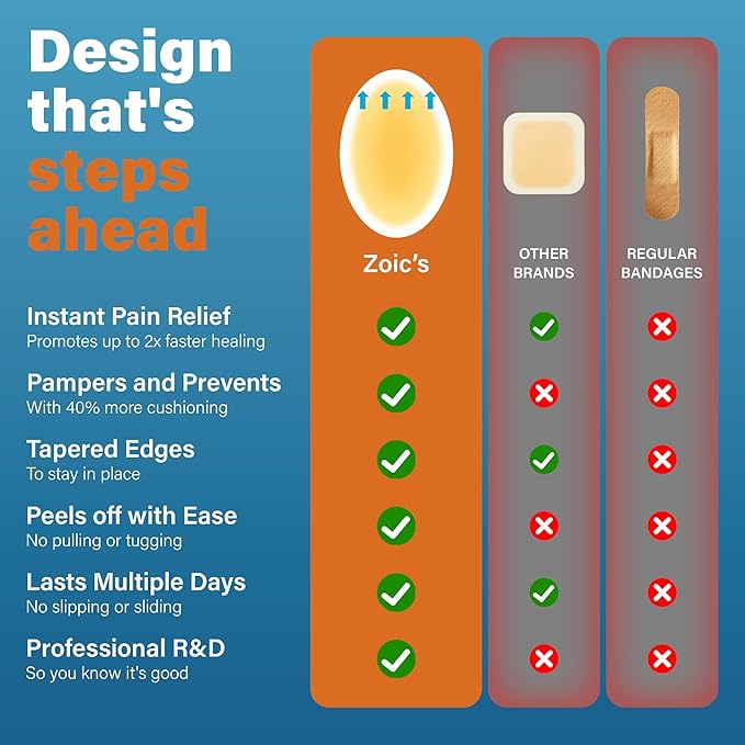 - Blister Prevention & Healing - Elevate your foot experience with Zoic blister bandages. Utilizing the latest sealing adhesive hydrocolloid technology, Our blister bandages provide a 25% increase in cushioning performance to ease friction, pressure, and pain caused by high intensity exercise, new shoes, high heels, walking, hiking or running.