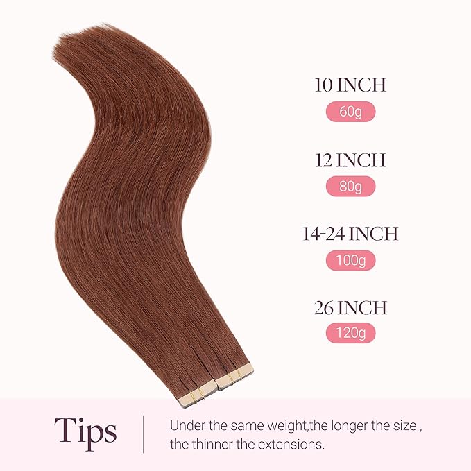 GOO GOO Tape in Hair Extensions Human Hair, #33B Dark Auburn Copper, 24inch 100g 40pcs, Skin Weft Seamless Invisible, Silky Straight with Thick Ends, Remy Human Hair