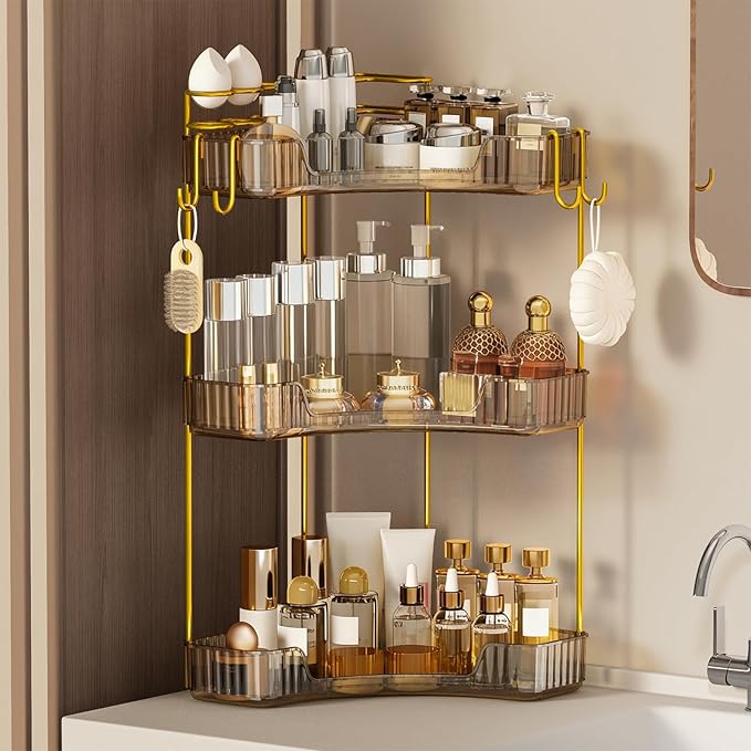 - 🚀 【High-Capacity Tiered Storage】: The three open, stair-step shelves have raised edges to prevent items from slipping.Easy to assemble,they are tall enough to hold larger bottles like toners, cleansers, and lotions, while keeping everything visible and within easy reach.