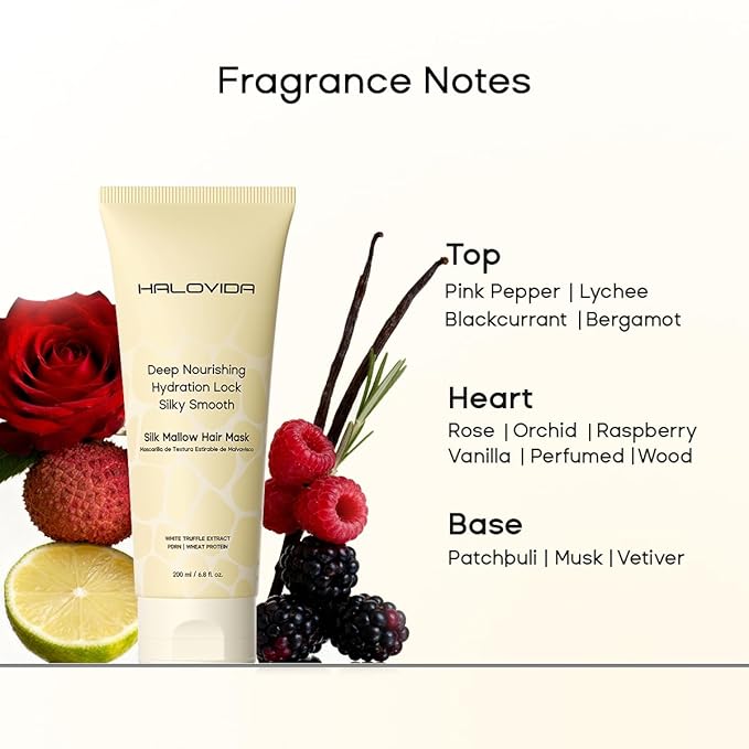 - 【Usage Tips】For deep nourishment and repair, focus application on the mid-lengths to ends where damage is most severeLeave on for 3-5 minutes. For severely damaged hair, we recommend that you wrap your hair with a warm towel or shower cap for 10-20 minutes after applying the hair mask, allowing the heat to help nutrients penetrate deep into the hair shaft. To achieve optimal results and maintain volume, avoid direct application to the scalp and roots. HALOVIDA Silk Hair Mask delivers noticeable improvement after just one use