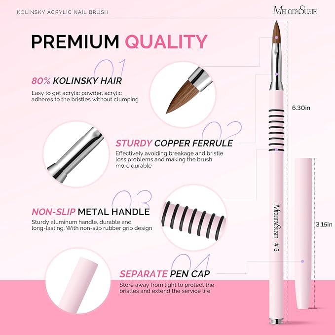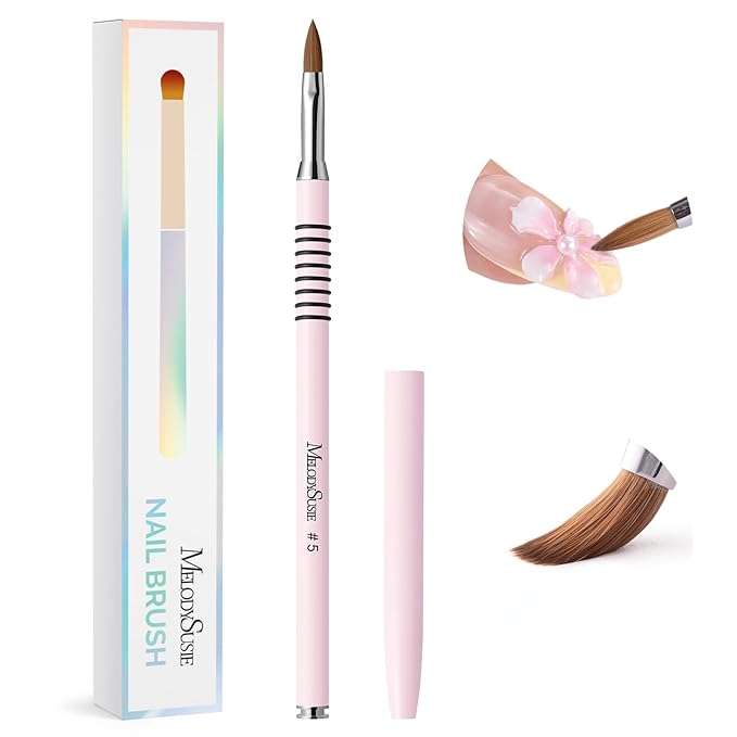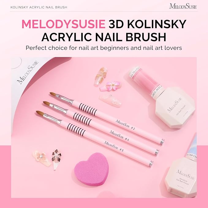 - Professional 3D Kolinsky Nail Brush: Quantity: 1, Color: Light pink. This acrylic nail brush is perfect for detailed nail art. The #2 size excels at micro-details like fine lines and tiny blossoms. The #4 size is perfect for sculpting medium-sized patterns like petals and leaves. The #5 size handles larger floral elements with ease, holding more product for voluminous designs.