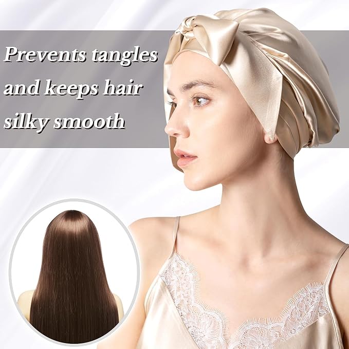- MULBERRY SILK:100% mulberry silk 22mm 6A grade silk, the silk bonnet for sleeping is smooth, soft and comfortable. Breathable and lightweight silk sleeping bonnet can reduces friction between your hair and the pillow, keeping moisture in your hair from tangling, protects your hair from damage and dust