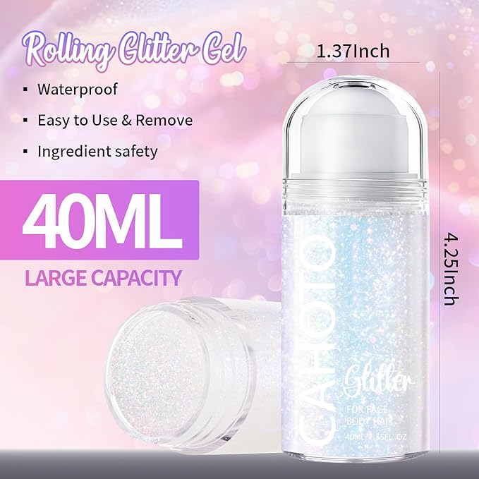 - [Holographic Glitter Gel] The aurora rolling glitter gel is a multi-use shimmer product for face, body, and hair, featuring a color-shifting finish that creates a rainbow-like glow from every angle. This unique effect ensures a multi-dimensional, eye-catching sparkle that stands out in any light, making it a versatile choice for creative makeup and body art.