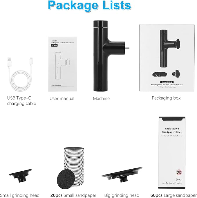 - PACKAGE DETAILS: 1*FCR-6 Rechargeable electric callus remover, 1*large grinding head (already installed on the machine), 1*small grinding head, 1*box large sandpaper discs (60pcs), 1*bag small sandpaper discs (20pcs), 1*USB Type-C charging cable, 1*user manual. (Please note: The fcr-6 electric foot sander is not waterproof.)