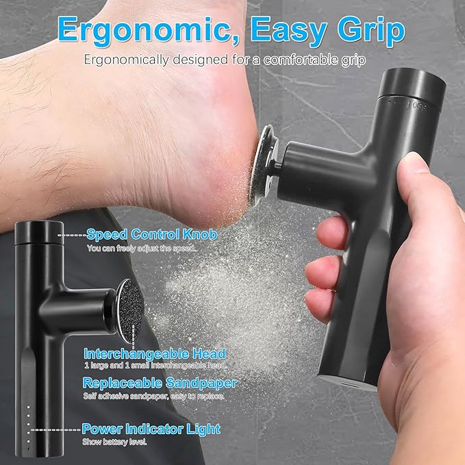 - REPLACEABLE SANDPAPER AND HEADS: FCR-6 electric foot sander features 2 sizes interchangeable grinding heads to remove dead skin and calluses from various areas of the foot. Both the grinding heads and sandpaper discs are replaceable and easy to clean. Always new, always fresh.