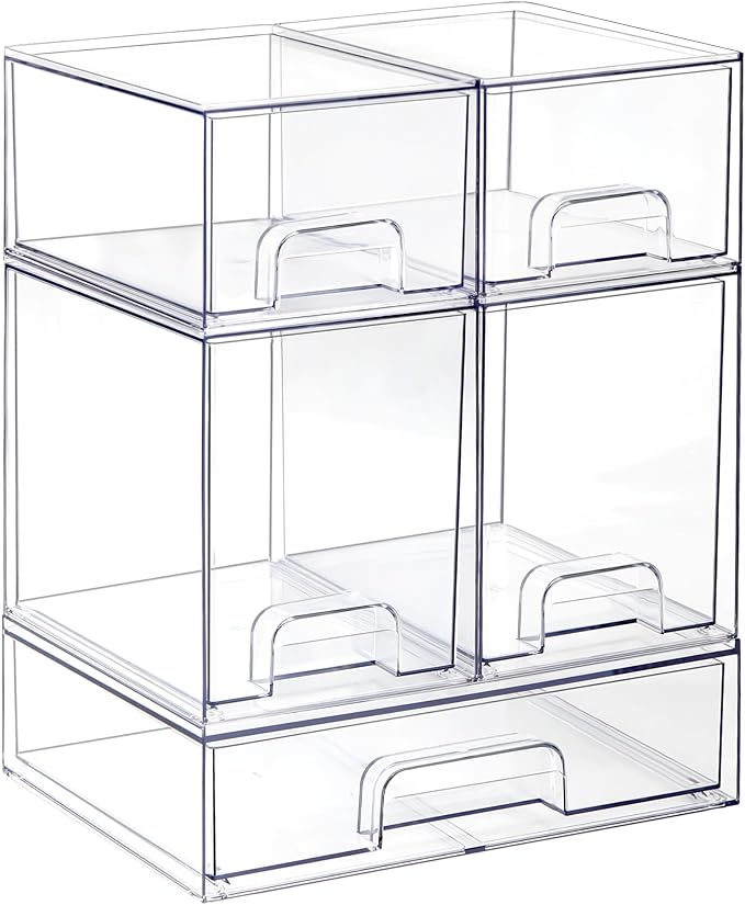 Clear Stackable Storage Drawers, Pull-Out Makeup Organizer, Transparent Baby Bottle Organizer, Storage Bins Suitable for Vanity Tables, Bathrooms, Kitchens (5-Piece Set)
