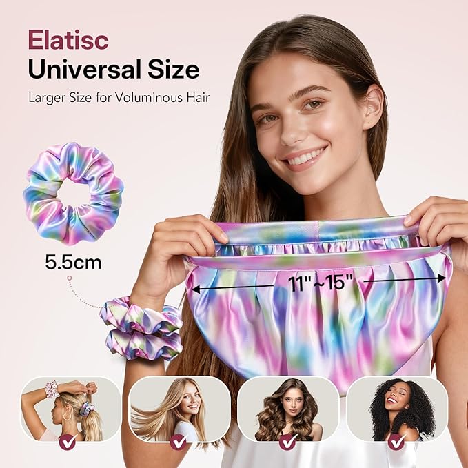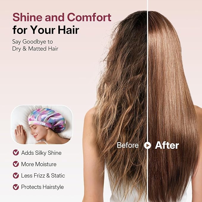 - Adjustable Band for All-Night Security: Featuring a soft, elastic adjustable band, our silk sleep bonnets for women stays securely in place without slipping or tightness. The curly hair sleep bonnet provides a gentle and secure hold for hair of all lengths and thicknesses, eliminating the hassle of complicated straps.